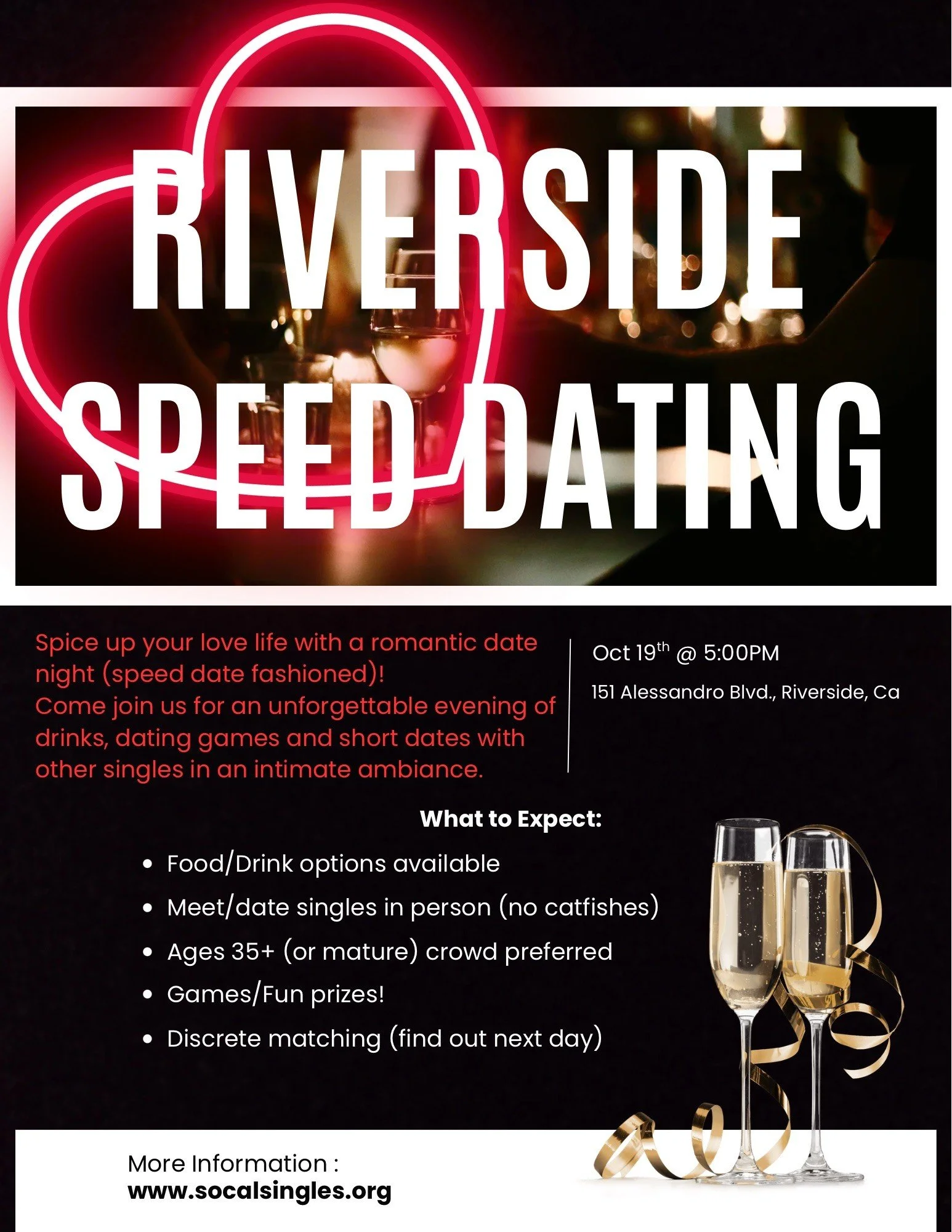 RSVP Riverside Speed Dating Admission Sale Price: $30.00 Original Price: $35.00 Sale Gender: Man Woman Add To Cart Added! Football Game Mixer Admission $20.00 Gender: Man Woman Score My Ticket Added! Halloween Masquerade Ball Admission Sale Price: $35.00 Original Price: $70.00 Sale Gender: Man Woman Unmask My Entry Added!